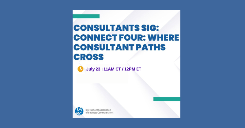 Join the IABC Consultants Shared Interest Group (SIG) for “Connect Four: Where Consultant Paths Cross” on Wednesday, July 23, at 11 a.m. CT / 12 p.m. ET.