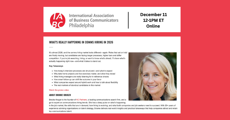 Join IABC Philadelphia for “What’s Really Happening in Comms Hiring in 2026” on Thursday, December 11, 12 p.m. ET. Brooke Kruger, founder of KC Partners, a leading communications search firm, will lead the discussion.