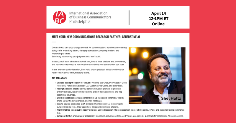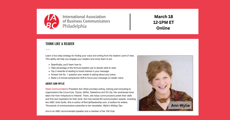 Join IABC Philadelphia for “Think Like a Reader” on Wednesday, March 18, at 12 p.m. ET. Ann Wylie, a writing trainer, coach, and communications consultant, will share a four-step strategy for finding your voice and writing from the readers’ point of view. This ability will help you engage your readers and move them to act. […]