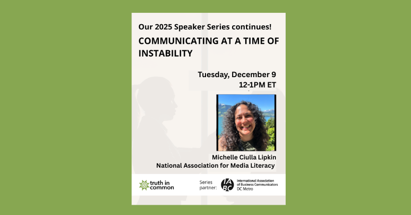 The fall segment of Truth in Common‘s 2025 Speaker Series continues on Tuesday, December 9, from 12-1 p.m. ET, with Michelle Ciulla Lipkin, former Executive Director of National Association for Media Literacy Education and Truth in Common advisor. IABC DC Metro is an event partner.